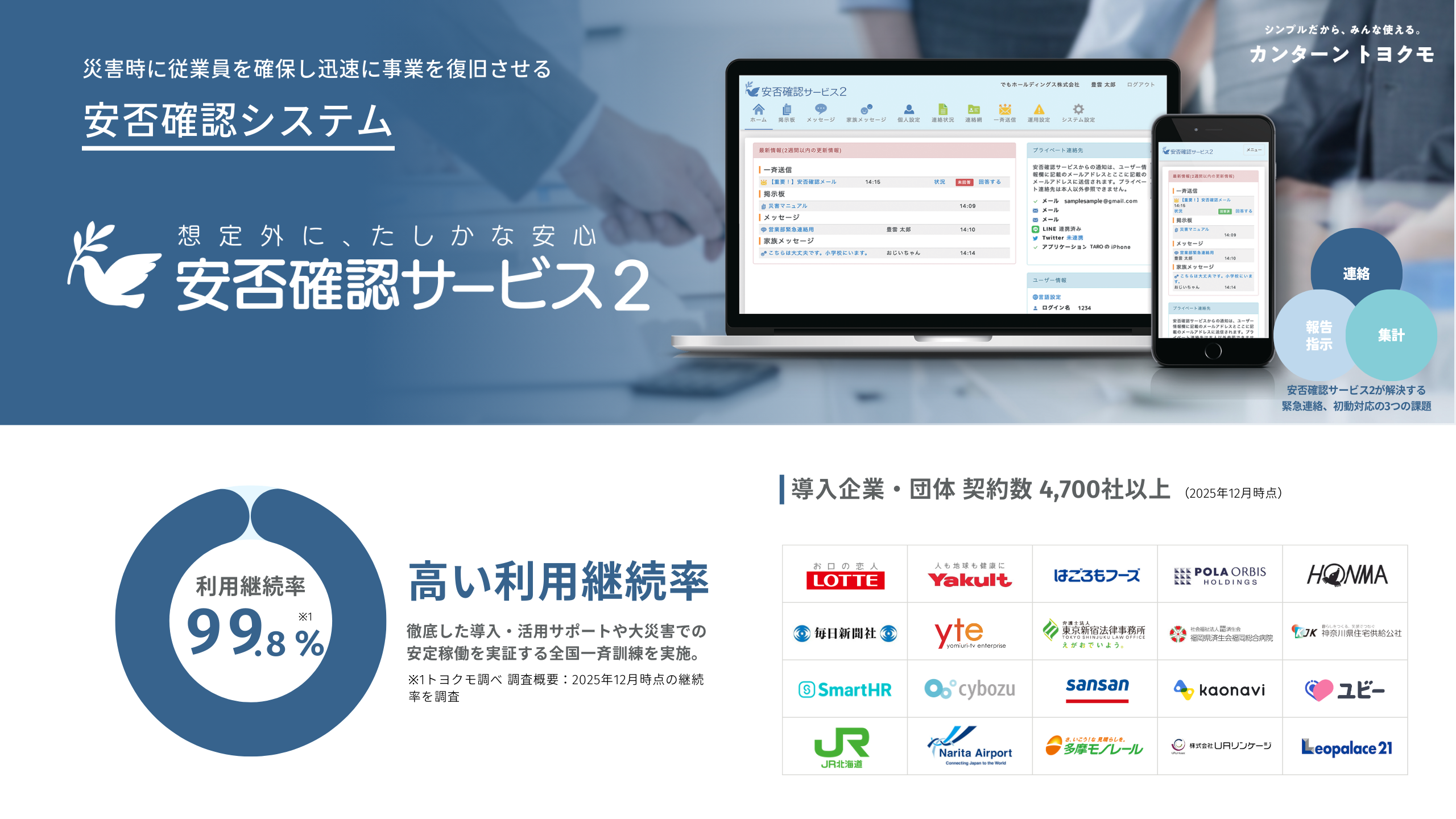 トヨクモ「安否確認サービス2」、利用者数300万人を突破 ~初動対応の自動化、企業BCPの基盤として定着~