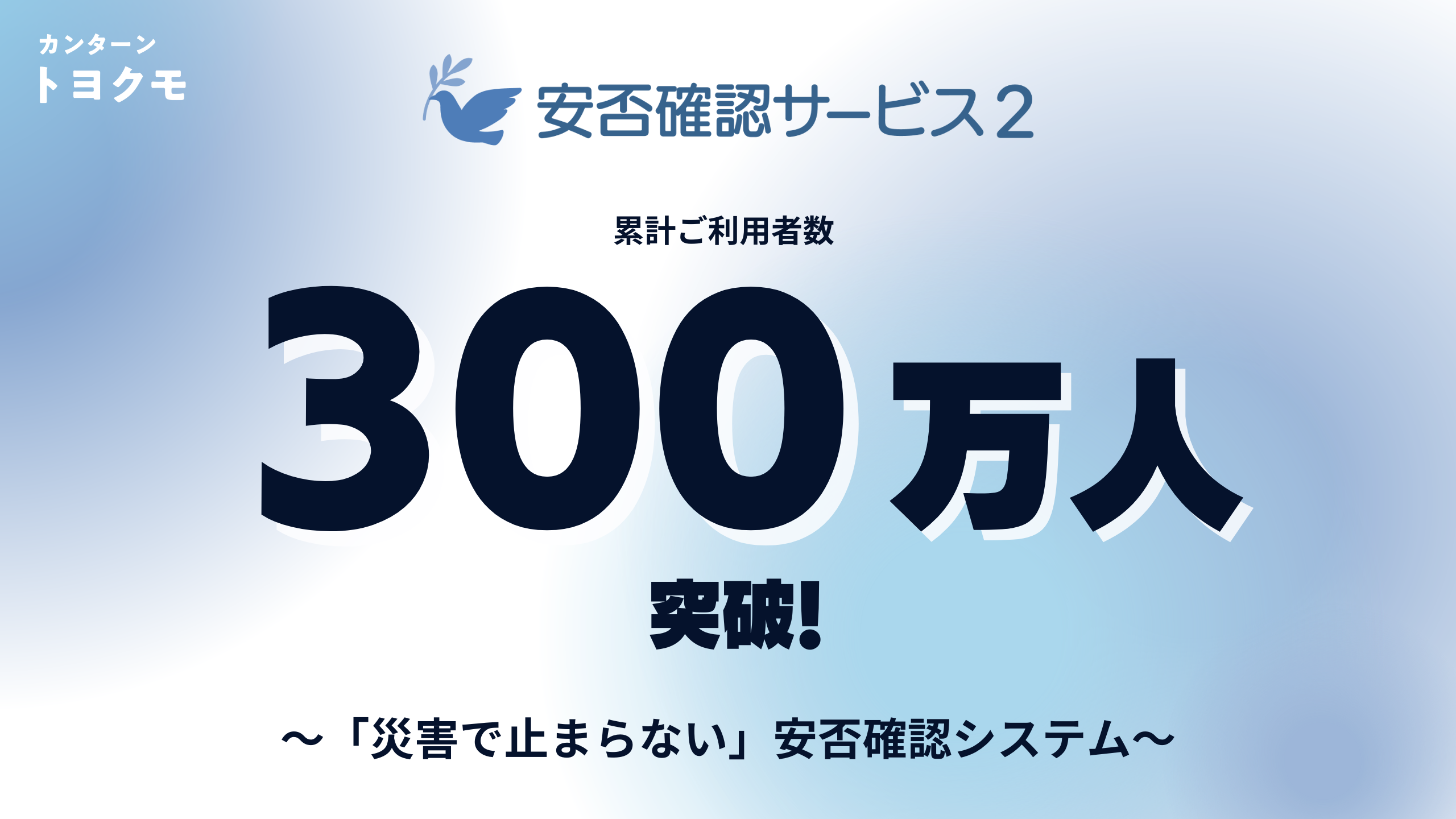 ビジネス向けのクラウドサービスを提供するトヨクモ株式会社(本社:東京都品川区、代表取締役社長:山本裕次、以下トヨクモ)は、法人向け安否確認システム「安否確認サービス2」の累計契約人数が300万人を突破したことをお知らせします。