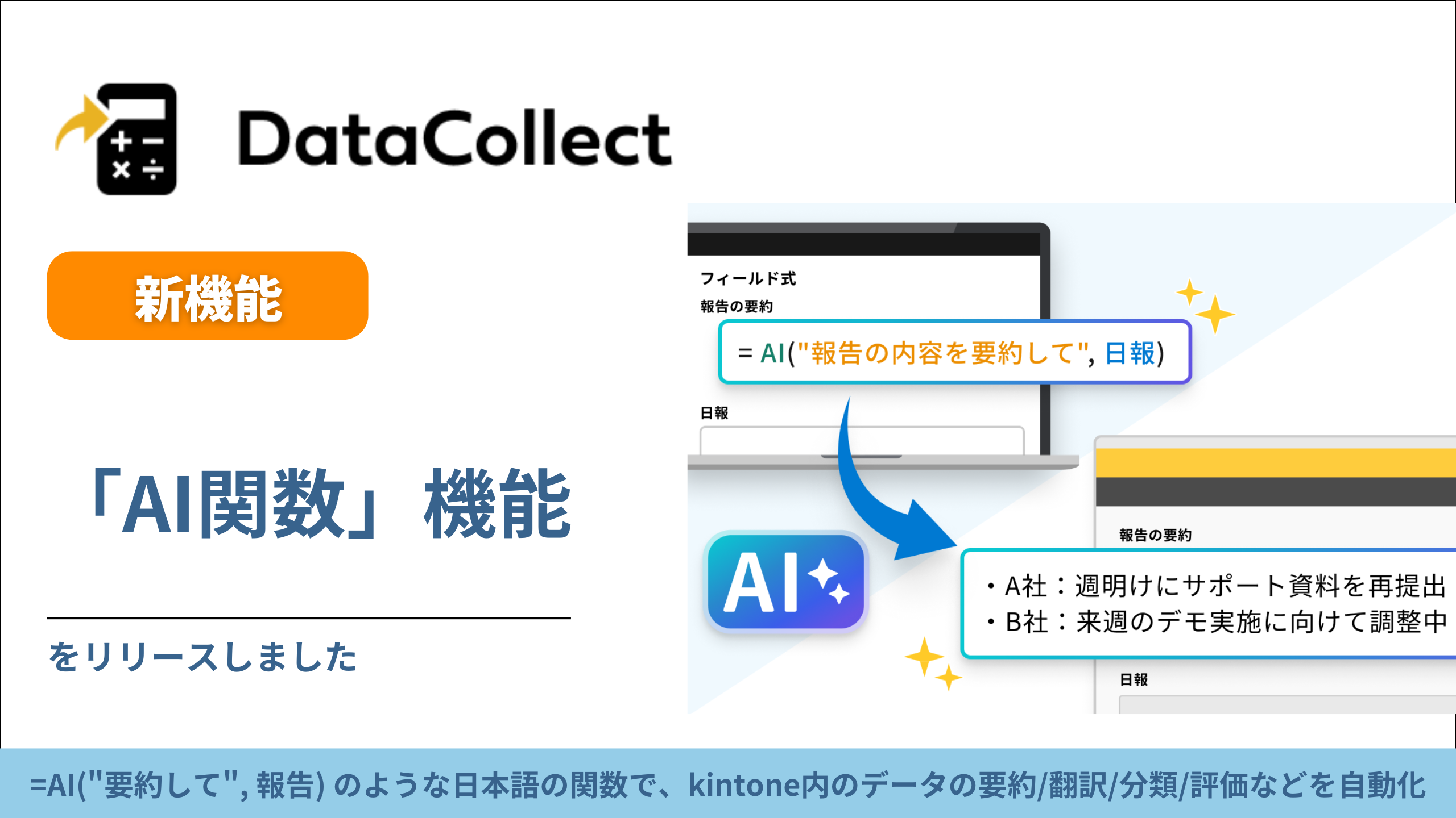 誰でも簡単に使えるビジネス向けのクラウドサービスを提供するトヨクモ株式会社(本社:東京都品川区、代表取締役社長:山本 裕次、以下トヨクモ)は、サイボウズ株式会社(本社:東京都中央区、社長:青野 慶久、以下サイボウズ)が提供する業務改善プラットフォーム「kintone」のデータ活用を支援するkintone連携サービス『DataCollect(データコレクト)』において、自然言語でAIに指示を出せる新機能「AI関数」を、2026年4月9日より全コースで追加費用なしで提供開始しました。