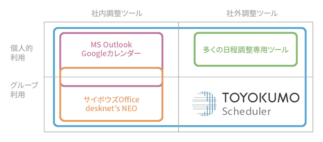 スケジューラーは個人のスケジュール管理から始まり、部署や全社のスケジュール管理を行うグループスケジューラーを経て、社内施設の予約やToDoリストの管理なども可能なグループウェアへと進化してきました。「トヨクモ スケジューラー」は、そういったグループウェアの機能に加えて、社外の方との予定調整もできる新たなコンセプトのスケジューラーです。